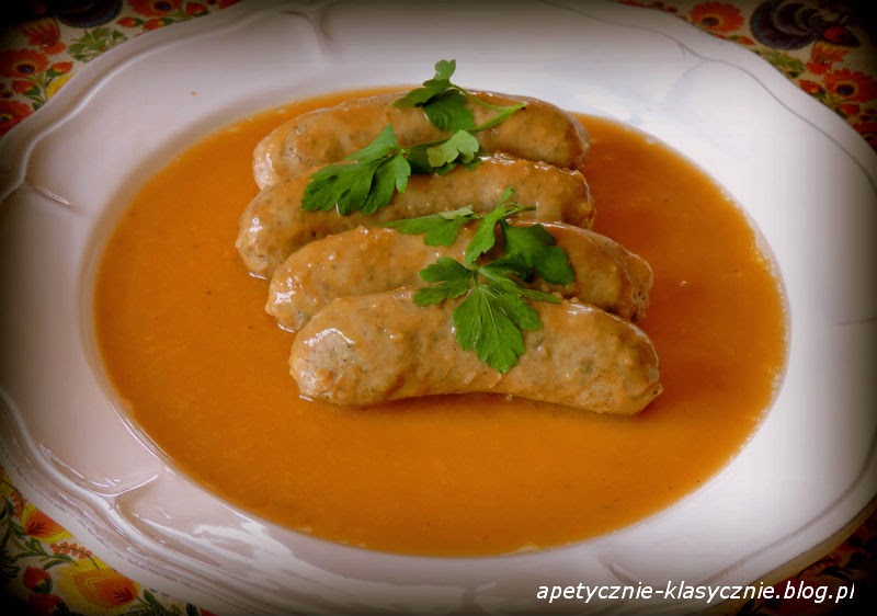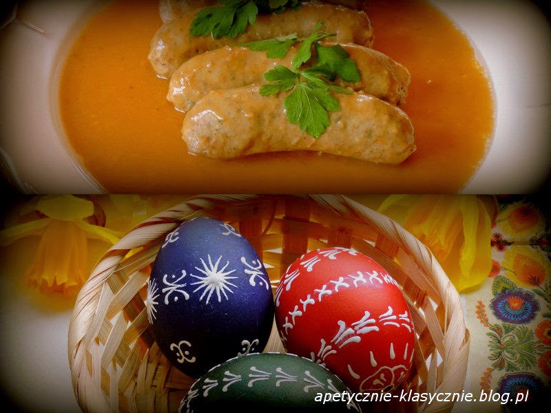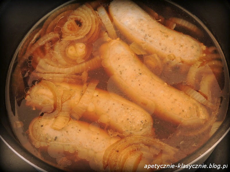 Biała kiełbasa kojarzy mi się z Wielkanocą, żurkiem lub barszczem podawanym z dodatkiem kiełbasy. Może być też daniem głównym, pieczona, gotowana lub duszona. Biała kiełbasa duszona w sosie z cebuli, ciemnego piwa i goździków jest soczysta i aromatyczna, a sos powstały podczas gotowania ma piękny brązowy kolor i delikatną piwną nutkę gorzko-słodką. Nie jestem wielką fanką białej kiełbasy, ale duszona w piwnym sosie jest bardzo apetyczna.