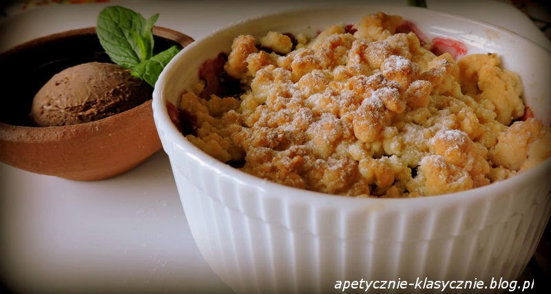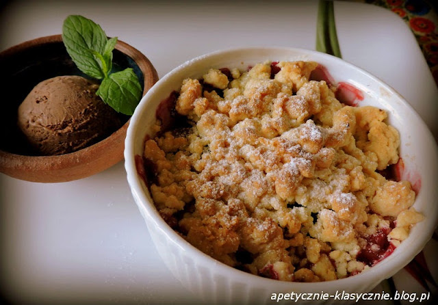 To jeden z moich ulubionych deserów. Właśnie to bardziej deser, niż ciasto, bo ciasta jest w nim mniej niż owoców. Możemy go przygotowywać przez cały rok, ale najsmaczniejszy jest późną wiosną i latem, kiedy mamy do wyboru mnóstwo pysznych owoców i możemy zaszaleć z różnymi ich kombinacjami. Na spodzie owoce pod wpływem temperatury stają się miękkie, a odrobina cukru sprawia, że puszczają apetyczny gęsty sok. Świetnie kontrastuje z nimi krucha złotawa kruszonka z waniliową nutką. Najlepiej przygotowywać deser w kokilkach do zapiekania. Ja uwielbiam podawać jeszcze ciepłe z lodami waniliowymi lub czekoladowymi. Mniam 🙂