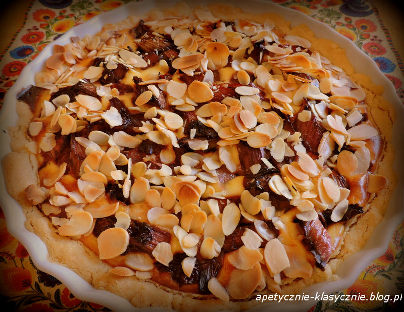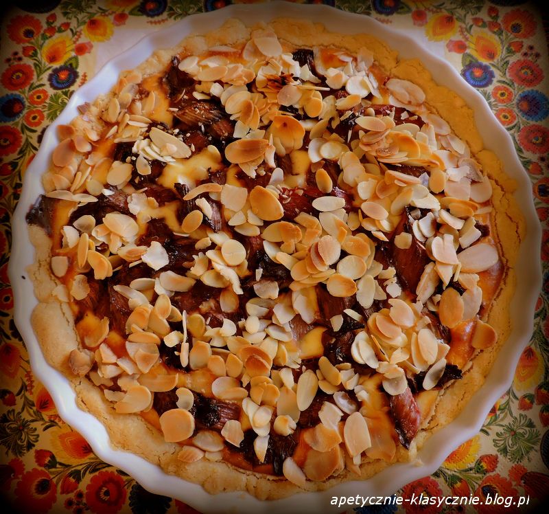 Dla mnie rabarbar to powrót do smaków dzieciństwa, kiedy jadło się kawałki rabarbaru zanurzając je w cukrze. Dwa przeciwstawne smaki kwaśny, lekko cierpki rabarbar i słodki cukier, bez których przełom wiosny i lata byłby trochę niepełny. Później zniknął z mojego życia na dość długo, a teraz powrócił po latach, jako świetny dodatek do ciasta. Na kruchym cieniutkim spodzie masa serowa z nutką wanilii z zatopionymi kawałkami kwaskowatego rabarbaru, a na wierzchu chrupiące płatki migdałów. Bardzo smakowite połączenie kilku warstw i kilku różnych smaków w harmonijną i bardzo interesującą całość.