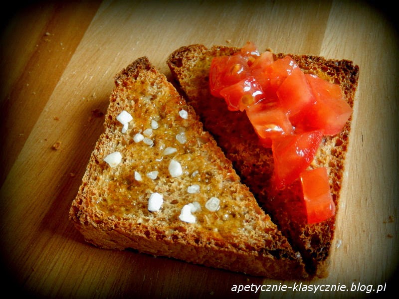 Zwarty chrupiący chleb pokrojony na kromki o grubości 1,5 cm umieszczamy w gorącym piekarniku i podpiekamy z obu stron. Następnie jeszcze gorący skrapiamy oliwą i posypujemy gruboziarnistą solą morską. W wersji „luksusowej” gorące kromki nacieramy ząbkiem czosnku, kładziemy pokrojonego drobno dojrzałego pomidora i skrapiamy oliwą z oliwek. Smacznego 🙂