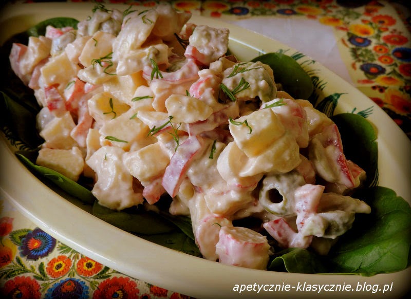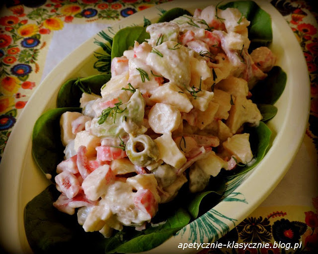 Świetna sałatka, którą robi się prosto i szybko. Jej wyjątkowość polega na zestawieniu niebanalnych składników: aksamitne awokado, soczyste jabłko, chrupiąca papryka, wytrawne oliwki i charakterystyczne paluszki krabowe. Sos słodko-pikantny z nutką czosnku idealnie łączy ze sobą wszystkie smaki i dodaje sałatce charakteru. Możemy ją podać i na drugie śniadanie i na lunch i na kolację. Jest sycąca i apetycznie wygląda.