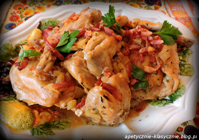 Mięso królika jest delikatne, kruche, lekkostrawne i zdrowe, a przede wszystkim bardzo smaczne. Bardzo lubię królika duszonego w białym winie z sosem śmietanowo-musztardowym. W tej wersji zamiast tradycyjnie używanego wina dusimy królika w cydrze jabłkowym, z cebulą i przyprawami. Danie jest niezwykle subtelne, a mięso wyjątkowo miękkie i bardzo apetyczne. Dodatkowym atutem dania jest sos z aromatem tymianku, kminku i wędzonego boczku o bardzo intensywnym smaku i zapachu. Po prostu palce lizać 🙂