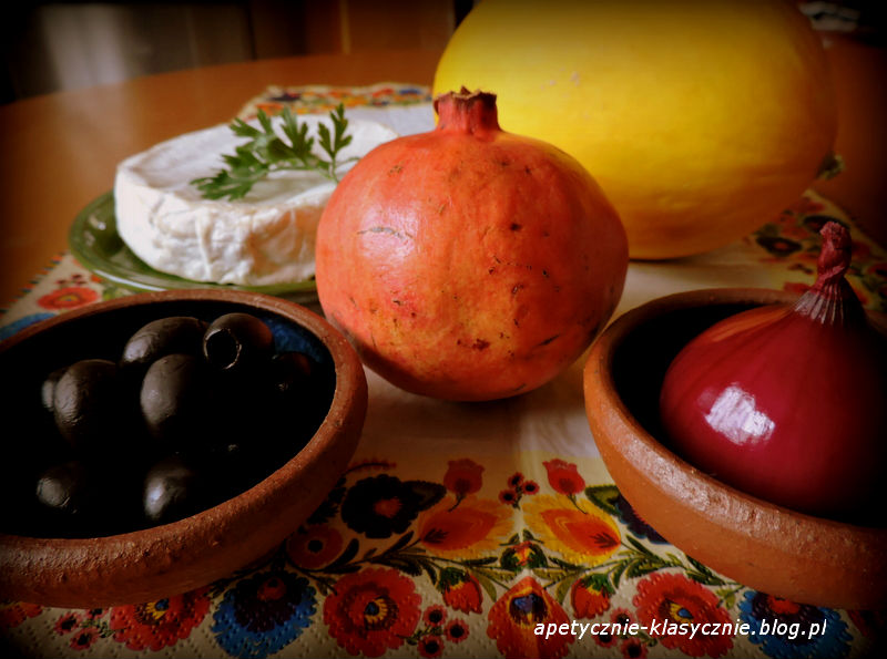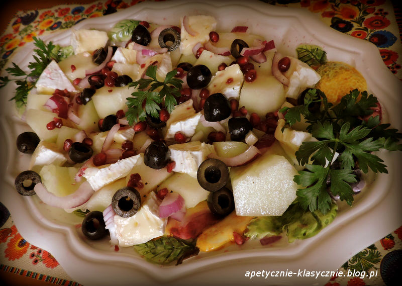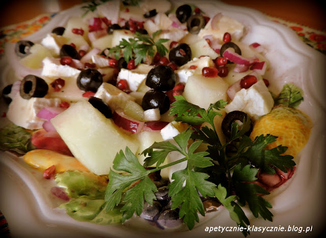 Sałatka ze względu na składniki kojarzy mi się z latem, wakacjami i przede wszystkim kuchnią śródziemnomorską. Soczysty melon to wspomnienie z wypoczynku we Włoszech, gdzie podają najpyszniejsze „prosciutto e melone”, czyli słonawą szynkę ze słodziutkim melonem. W tej sałatce szynkę zastąpiłam wyrazistym pleśniowym serem typu „camembert”, kojarzącym się z kuchnią francuską. Pozostałe dodatki w postaci oliwek i czerwonej cebuli, to nawiązanie do kuchni greckiej. Pestki granatu nadają sałatce nutkę egzotyki i mają wspaniały ciemnoczerwony kolor. Pyszna, niebanalna sałatka, świetnie pasująca na romantyczną kolację lub ciekawą przystawkę obiadową 🙂