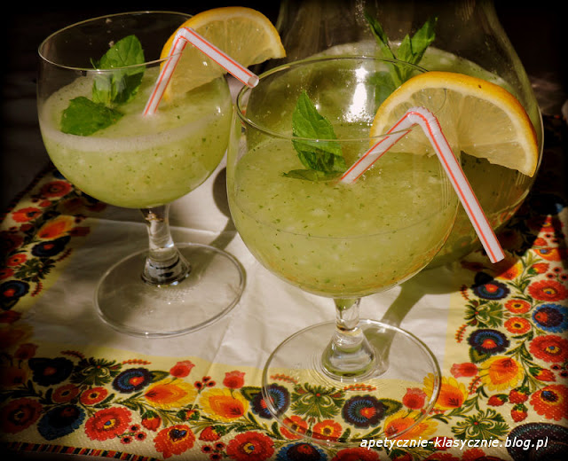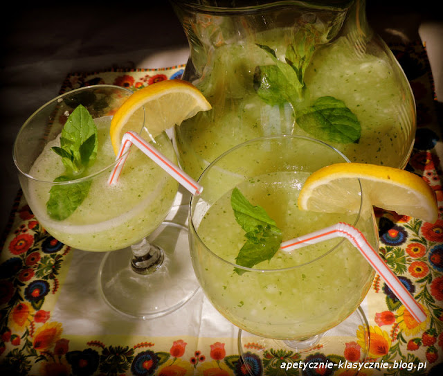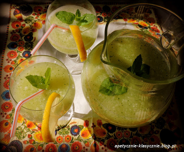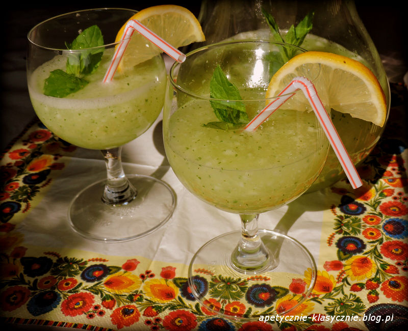 Ogórka i melona obieramy, usuwamy nasiona i kroimy w kawałki. Miksujemy wszystkie składniki, oprócz wody. Dodajemy wodę, mieszamy łyżką i podajemy. Jeśli napój nie jest wystarczająco chłodny, możemy dodać kilka kostek lodu. Podajemy udekorowane listkami mięty i plasterkami cytryny lub ogórka. Smacznego 🙂