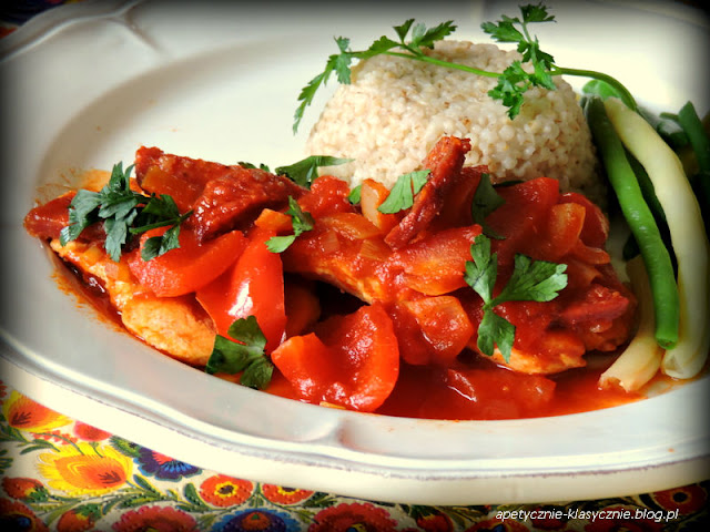 Im bardziej szaro za oknem, tym bardziej mam ochotę na kolorowe dania na talerzu. Ta potrawa ma właśnie piękny energetyczny kolor, który pozytywnie wpływa na nasz nastrój, a dodatkowo jest też bardzo smaczna. Delikatne mięso indyka w mocno paprykowym, odrobinę pikantnym sosie z dodatkiem salami, pomidorów i cebuli. Nazwałam ten sos węgierskim właśnie ze względu na składniki typowe dla węgierskiej kuchni. Świetnie pasuje do kaszy lub ryżu, jako lekkie apetyczne i kolorowe danie obiadowe.