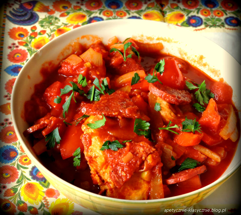 Im bardziej szaro za oknem, tym bardziej mam ochotę na kolorowe dania na talerzu. Ta potrawa ma właśnie piękny energetyczny kolor, który pozytywnie wpływa na nasz nastrój, a dodatkowo jest też bardzo smaczna. Delikatne mięso indyka w mocno paprykowym, odrobinę pikantnym sosie z dodatkiem salami, pomidorów i cebuli. Nazwałam ten sos węgierskim właśnie ze względu na składniki typowe dla węgierskiej kuchni. Świetnie pasuje do kaszy lub ryżu, jako lekkie apetyczne i kolorowe danie obiadowe.