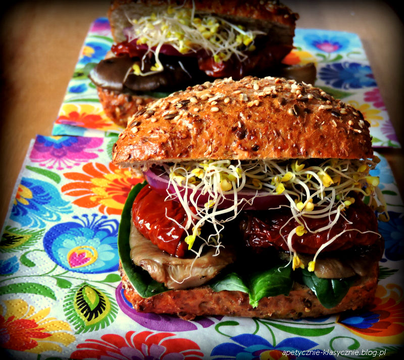 Piekarnik rozgrzewamy do 230 stopni. Z boczniaków odcinamy twarde końce. Grzyby układamy na blasze wysmarowanej olejem lub papierze do pieczenia wysmarowanym olejem, spryskujemy olejem, posypujemy solą, pieprzem i tymiankiem. Wstawiamy do gorącego piekarnika (na górną półkę) i pieczemy 12 minut. W połowie pieczenia przewracamy boczniaki na drugą stronę. Bułki lekko zwilżamy wodą i wkładamy do piekarnika nagrzanego do 230 stopni na około 2 minuty. Bułki wyjmujemy, kroimy na pół, smarujemy wewnątrz majonezem i keczupem, następnie układamy grzyby i dodatki. U mnie to szpinak, suszone pomidory, cebula i kiełki. Smacznego 🙂