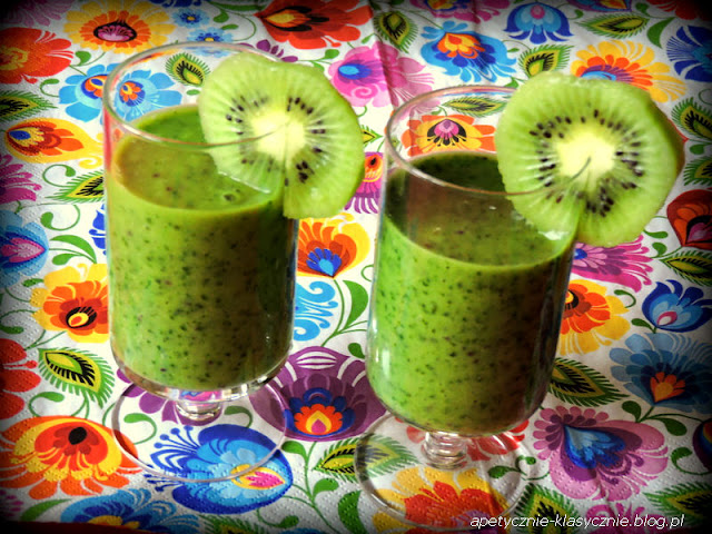 Wszystkie składniki dokładnie miksujemy na gładki napój. Przelewamy do szklanek, dekorujemy kiwi lub pomarańczą. Smacznego 🙂