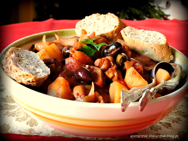 To pyszne i krzepiące danie jednogarnkowe. Polecam na rodzinny zimowy obiad, szczególnie po spacerze w mroźny dzień, kiedy przyda się coś konkretniejszego do zjedzenia. Miękkie kawałki kurczaka z mnóstwem dodatków w smacznym aromatycznym sosie, w którym możemy maczać kawałki chleba. Pożywne ziemniaki, wyraziste oliwki, cebula, czosnek, pieczarki, odrobina wędzonego boczku, pomidory, czerwone wino i delikatny aromat rozmarynu skomponowane w apetyczną całość.