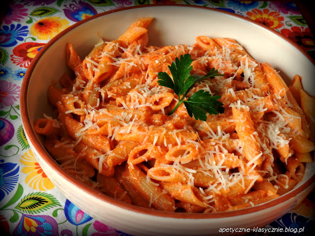 Makaron gotujemy „al dente” zgodnie z przepisem na opakowaniu. W tym czasie przygotowujemy sos. Na dużej patelni podsmażamy na maśle bardzo drobno pokrojoną cebulę, dodajemy paprykę i przecier pomidorowy. Smażymy przez 2 -3 minuty na małym ogniu, mieszając. Wlewamy wódkę, gotujemy przez około 10 minut. Zestawiamy z ognia, dodajemy śmietanę, mieszamy, dodajemy odcedzony makaron. Mieszając, podgrzewamy przez minutę, aby sos pokrył makaron. Posypujemy serem i podajemy. Smacznego 🙂