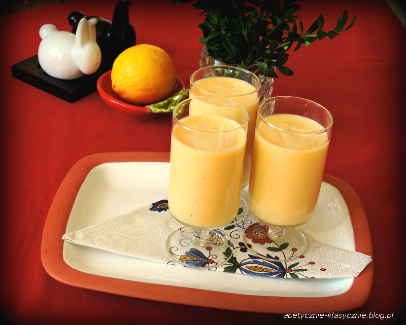 Banana i mango obieramy i dzielimy na kawałki, dodajemy sok wyciśnięty z cytryny i miód. Miksujemy, dodajemy mleko kokosowe, miksujemy na gładko i od razu podajemy. Smacznego 🙂