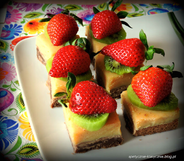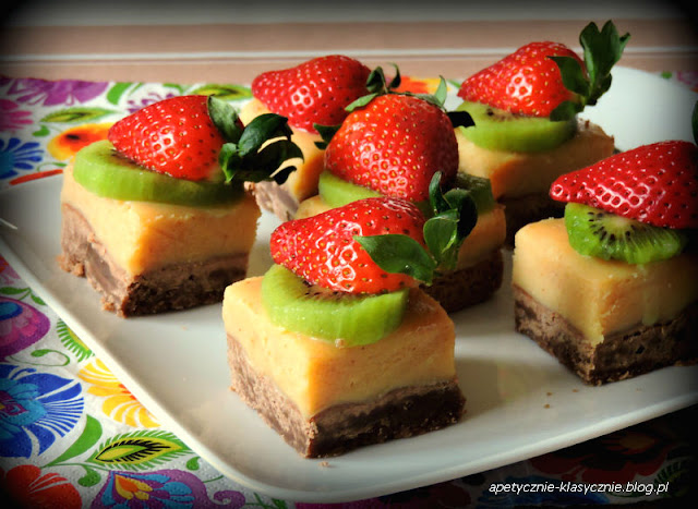 To deser dla prawdziwych wielbicieli słodyczy. Jeśli jesteście na diecie, to lepiej nie patrzeć w jego stronę. Trzy pyszne warstwy, a każda o innym smaku i strukturze. Na spodzie kruche ciasto kakaowe, w środku delikatna rozpływająca się w ustach masa karmelowa i na wierzchu kwaskowate owoce, które równoważą słodycz pozostałych elementów. Wspaniały deser o bogatym smaku i pięknym wyglądzie. Zamiast owoców możemy wierzch udekorować polewą czekoladową lub wiórkami kokosowymi, ale mnie najbardziej smakuje z malinami lub truskawkami i kiwi. Polecam 🙂