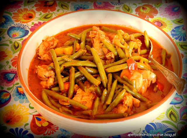 Nie jestem fanką napojów gazowanych. Z pewnością lepiej na nasze zdrowie działają soki lub woda mineralna. Jednak od czasu do czasu pozwalam sobie na małe grzeszki. Tym razem coca-cola sprawdziła się nie jako dodatek do dania, ale jego składnik. Powstała fajna potrawa, w której delikatne kawałki kurczaka, cebula i papryka zostały zatopione w gęstym i aromatycznym sosie. Cola połączyła swój specyficzny, słodkawy smak ze słonawym sosem sojowym, kwaskowatym przecierem pomidorowym, czosnkiem, ziołami prowansalskimi i ostrą papryką. Całość jeszcze wzbogaciłam jędrną zieloną fasolką szparagową. Danie świetnie smakuje z ryżem lub świeżym pieczywem. Polecam 🙂