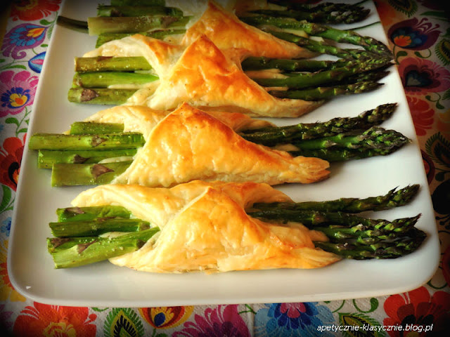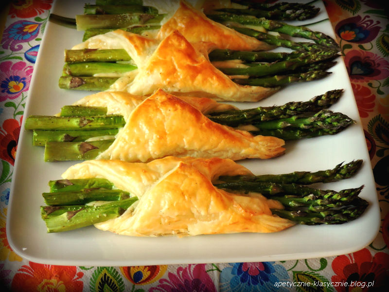 Sezon na szparagi trwa krótko, więc przygotowuję je gdy tylko się pojawiają. Do tej pory najczęściej szparagi gotowałam na parze i podawałam z delikatnym sosem. Jednak tym razem pierwsze w tym roku szparagi upiekłam z serem w cieście francuskim. Danie bardzo proste, ładnie się prezentujące i smaczne. Tak przygotowane szparagi są bardzo jędrne, otulone w stopionym serze i chrupiącym cieście francuskim smakują świetnie. Podałam na rodzinną kolację i wszyscy byli tak zadowoleni, że niedługo planujemy powtórkę 🙂