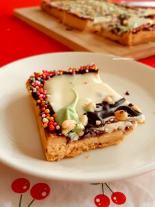 Wszystkie składniki na ciasto zagniatamy ręcznie lub w malakserze, zawijamy w folię spożywczą i wkładamy na pół godziny do lodówki. Z papieru przygotowujemy prostokątny szablon o wymiarach 25 na 15 cm. Ciasto rozwałkowujemy na papierze do pieczenia na grubość około 3 – 4 mm, wycinamy kształt zgodnie z szablonem, z pozostałego ciasta formujemy cienkie wałeczki, przyklejamy do brzegu ciasta wcześniej posmarowanego odrobiną białka. Ciasto ponownie wkładamy do lodówki na 45 minut. Przed pieczeniem dno ciasta nakłuwamy widelcem, układamy z papierem na blaszce i wstawiamy do piekarnika nagrzanego do 200 stopni, pieczemy 20 – 25 minut, do zarumienienia, wyjmujemy, pozostawiamy do ostygnięcia, np. na noc. Ciasto delikatnie przenosimy na talerz lub deskę, wystający brzeg smarujemy roztopioną gorzką czekoladą przy pomocy rękawa cukierniczego, posypujemy posypką, dno ciasta smarujemy cienko powidłami lub dżemem, wstawiamy na pół godziny do lodówki. Czekoladę białą i masło rozpuszczamy w kąpieli wodnej lub w mikrofalówce, gdy ostygnie, wylewamy na warstwę powideł lub dżemu (pozostawiając 1 łyżeczkę czekolady, do której dodajemy zielony barwnik, mieszamy), wyrównujemy powierzchnię lekko potrząsając, gorzką czekoladą rysujemy gałązki, resztę czekolady przekładamy na spodeczek. Orzeszki maczamy z jednego końca w czekoladzie gorzkiej lub czekoladzie białej zabarwionej na zielono, układamy przy narysowanych gałązkach, jak bazie. Wstawiamy ciasto na pół godziny do lodówki. Smacznego 🙂