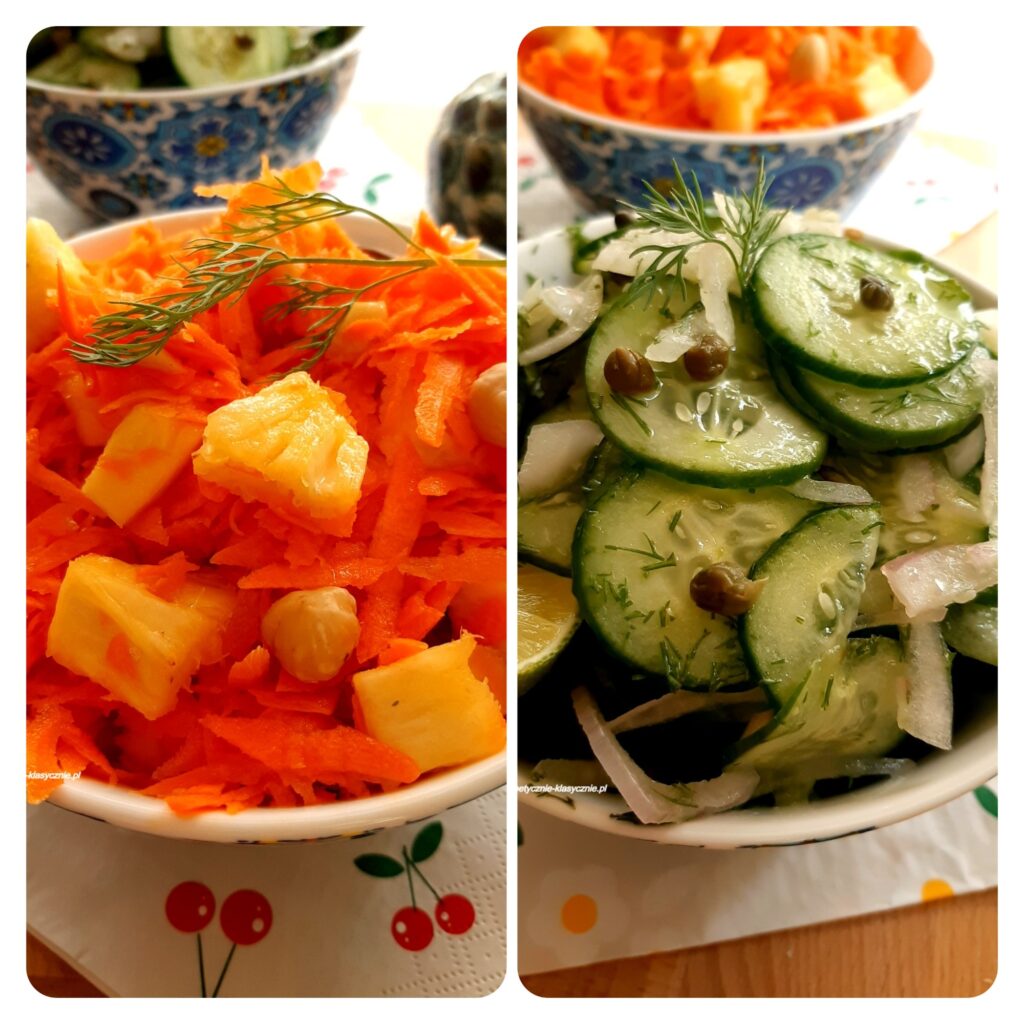 Smaczne, zdrowe, lekkie i orzeźwiające sałatki idealne na grilla, bez majonezu. Proste składniki, łatwe do zrobienia, pasują do grillowanym mięs, smażonych steków albo pieczeni. Majówka, a jednocześnie rozpoczęcia sezonu grillowego przed nami, przydadzą się pomysły na sałatki, które można szybko przygotować na miejscu lub spakować i zabrać ze sobą. Pierwsza to sałatka z marchewki, z dodatkiem ananasa i orzechów, o pięknym energetycznym kolorze z lekkim sosem na bazie soku z cytryny, oliwy i miodu. Druga to orzeźwiająca sałatka ze świeżych ogórków z cebulą, kaparami i koperkiem z dodatkiem wyrazistego dressingu z soku z cytryny, czosnku i oliwy. Sałatki smakują rewelacyjnie, można wybrać jedną z nich lub przygotować obie. Gorąco polecam 🙂