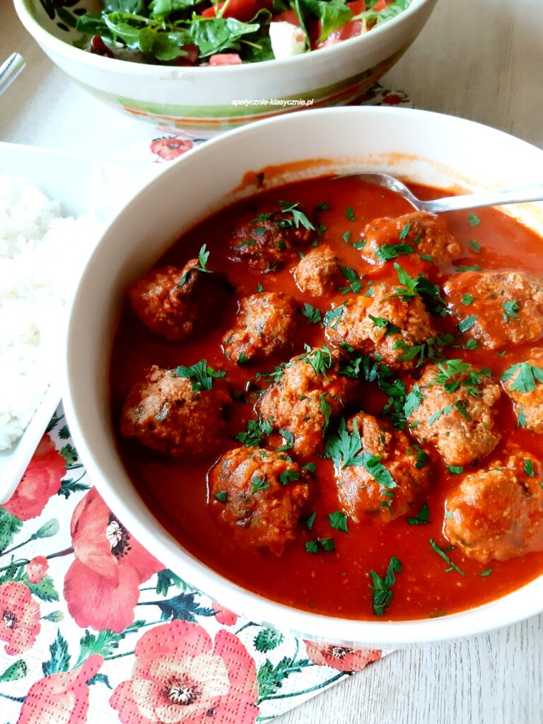 Znane i lubiane klopsiki w sosie pomidorowym. Delikatne klopsiki z indyka doprawione kminem, czosnkiem i słodką papryką otulone aromatycznym sosem pomidorowym. Klopsiki to fajna alternatywa dla kotletów mielonych. Dodatkową zaletą jest aromatyczny sos pomidorowy, którym możemy polać ryż, kaszę, makaron lub ziemniaki. Świetne danie na rodzinny obiad. Klopsiki w sosie pomidorowym można przygotować dzień wcześniej i podgrzać następnego dnia, wtedy smakują jeszcze lepiej. Klasyka zawsze pysznie smakuje. Polecam serdecznie 🙂