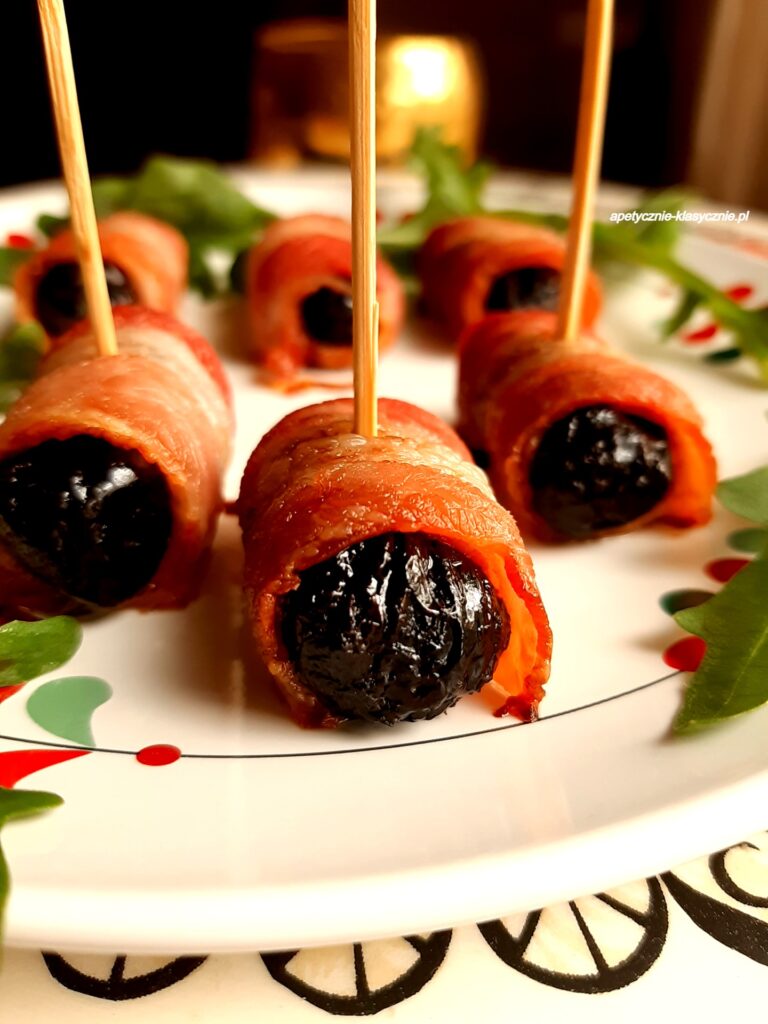 Hit każdej imprezy, czyli śliwki w boczku. Szybko się je robi i znikają też błyskawicznie. Połączenie suszonej lub wędzonej śliwki i chrupiącego wędzonego boczku, to przysmak znany i lubiany od lat. Idealnie sprawdza się jako przystawka na pobudzenie apetytu lub przekąska tzw. finger food, do której nie trzeba talerzyków, ani sztućców. Śliwki w boczku można podawać w formie koreczków, czyli nadziewać na wykałaczki, dzięki temu jeszcze szybciej trafiają do buzi. Śliwki w boczku to smakołyk, którego nie trzeba przedstawiać osobom lubiącym mięso i połączenie słodko-słonych smaków. Śliwki w boczku smakują tak rewelacyjnie, że warto od razu zrobić podwójną porcję. Serdecznie polecam 🙂