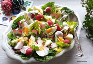Kolorowa i efektowna sałatka z białą kiełbasą, jajkami, sałatą, rzodkiewką z sosem chrzanowym będzie piękną ozdobą świątecznego stołu 🙂