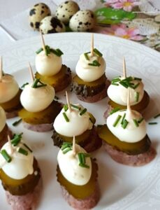 Odświętne koreczki z białej kiełbasy, jajek przepiórek i ogórków kiszonych, pyszne i oryginalne 🙂