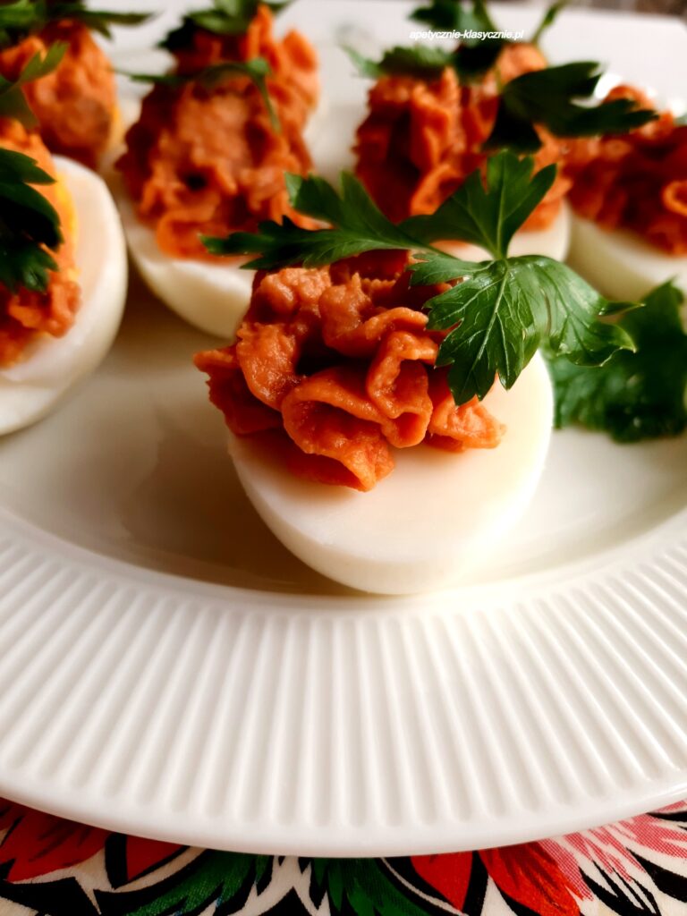 Intensywna w smaku pasta z ciecierzycy i suszonych pomidorów, pyszna i oryginalna. Fantastycznie sprawdzi się do faszerowania jajek. Jajka faszerowane pastą z ciecierzycy z suszonymi pomidorami to rewelacyjny pomysł na urozmaicenie kolacji, jako przystawka lub na śniadanie, pasuje także na spotkanie z rodziną lub przyjaciółmi. Oczywiście to też idealny pomysł na Wielkanoc. Jajka faszerowane w ten sposób będą piękną ozdobą świątecznego stołu. Uwielbiam połączenie ciecierzycy i suszonych pomidorów, te smaki świetnie się ze sobą komponują. Wierzch można udekorować świeżymi ziołami. Serdecznie polecam 🙂