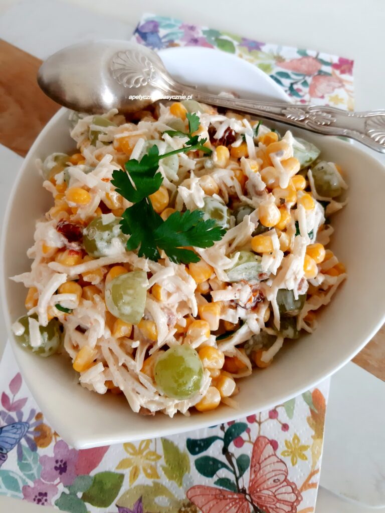 Sałatka łączy w sobie delikatny smak selera konserwowego z soczystymi winogronami, chrupiącą kukurydzą i kwaskowymi suszonymi pomidorami. Proste składniki, łatwa do zrobienia i bardzo smaczna. Zaletą tej sałatki jest też jej uniwersalność, pasuje na kolację, przekąskę lub dodatek dań obiadowych mięsnych lub rybnych. Sałatkę z selera konserwowego można po prostu w salaterce, czy misce, albo w wydaniu bardziej imprezowym np. w rulonikach z szynki. Sałatkę z selera konserwowego często wzbogaca się szynką lub serem żółtym, ale moja jest w lżejszej wersji, która bardziej pasuje na Świętach Wielkanocnych. Do sałatki można dodać posiekane orzechy albo pestki dyni, aby sałatka była bardziej chrupiąca. Do sałatki najbardziej pasują winogrona bezpestkowe. Gorąco polecam na przystawkę lub kolację 🙂