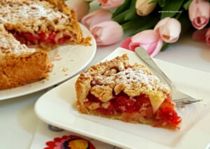 Szarlotka z rabarbarem to prawdziwa petarda, krucha, kwaskowa, z kruszonką na wierzchu 🙂