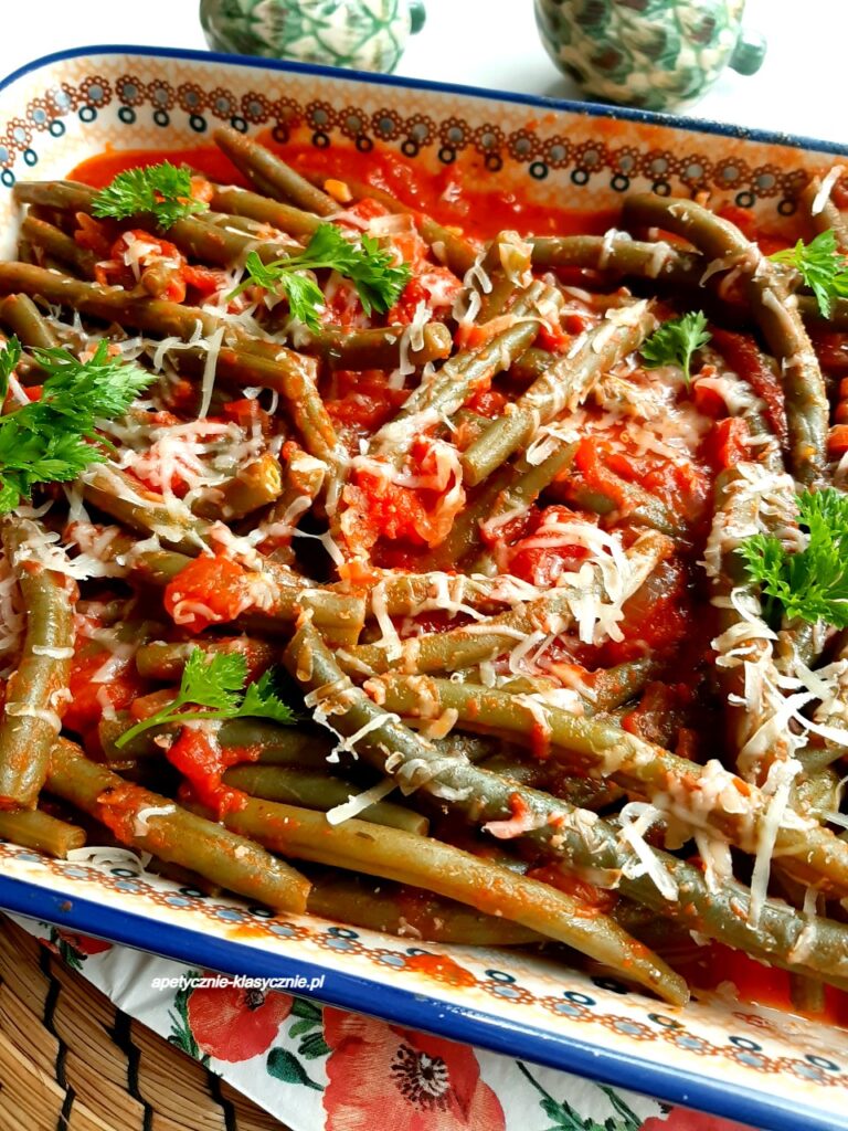 Dobrany duet. Chrupiąca fasolka szparagowa w aromatycznym sosie z pomidorów. Można ją podać, jako ciekawy dodatek do obiadu lub samodzielne, lekkie danie ze świeżym pieczywem. Świetny pomysł na fasolkę szparagową, w lecie świeżą, a poza sezonem można użyć mrożonej. To prosta i smaczna potrawa, która uda się każdemu, nawet bez doświadczenia w kuchni. Serdecznie polecam 🙂