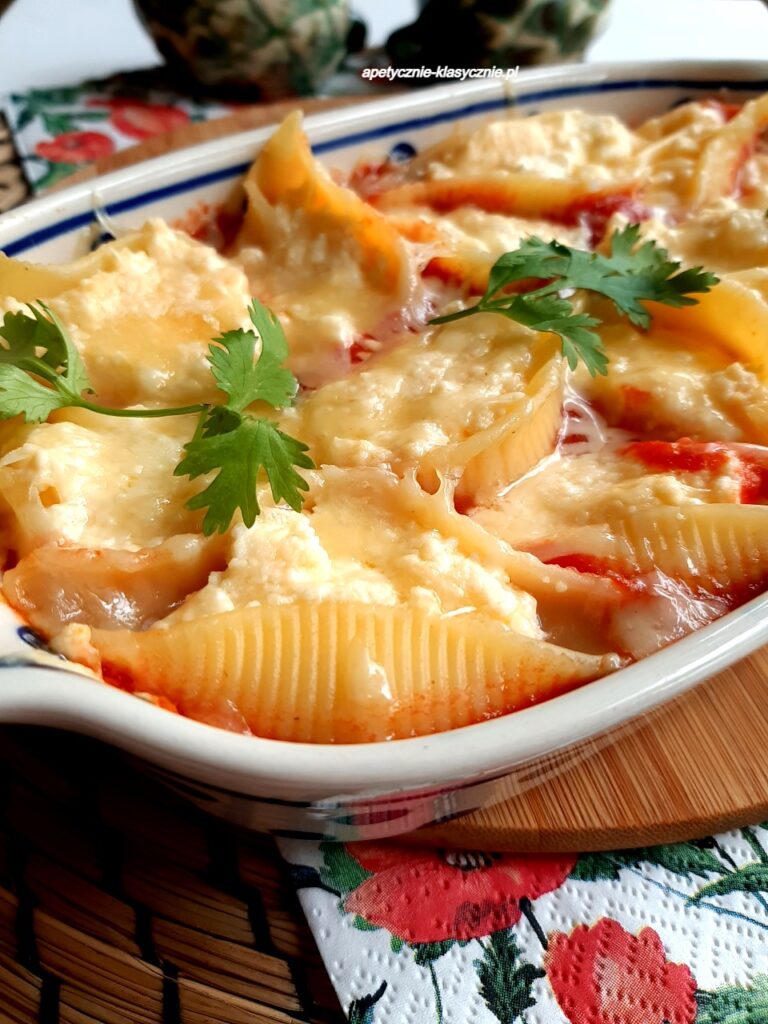 Muszle makaronowe nadziewane farszem z trzech włoskich serów, zapiekane z przecierem pomidorowym (passata) i przyprawami. Muszle makaronowe po włosku to pyszne i apetyczne danie, które efektownie wygląda i łączy w sobie charakterystyczne dla kuchni włoskiej składniki. Może się wydawać, że to potrawa skomplikowana, ale tak naprawdę można ją łatwo przygotować, a efekt na pewno zachwyci bliskich i przyjaciół. Ugotowanie makaronu i przygotowanie nadzienia jest proste, wystarczy wymieszać składniki, co nie zajmuje więcej niż 15 minut. Do farszu polecam połączenie trzech włoskich serów: ricotta, parmezan i mozzarella. Gotowy sos z passaty i zapiekanie też nie sprawi kłopotu. Muszle makaronowe po włosku to danie, które uda się każdemu, nawet bez doświadczenia w kuchni. Gorąco polecam 🙂