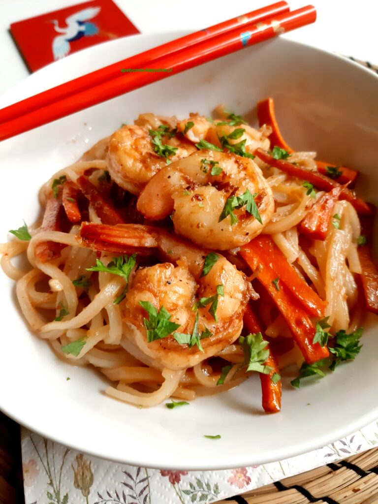 W woku lub patelni z grubym dnem rozgrzewamy olej do smażenia, dodajemy marchewkę, smażymy mieszając przez 2 minuty, dodajemy chili, imbir i czosnek, smażymy przez 1 minutę. Wlewamy sos rybny, sos sojowy, wkładamy krewetki, smażymy mieszając przez 2 – 3 minuty (zależnie od wielkości krewetek), odsuwamy na bok krewetki, dodajemy olej sezamowy, ocet ryżowy i cukier, smażymy przez 10 – 15 sekund, dodajemy makaron, smażymy przez pół minuty mieszając wszystko razem. Zdejmujemy z ognia, doprawiamy solą i pieprzem, posypujemy natką pietruszki lub kolendry i podajemy. Smacznego 🙂