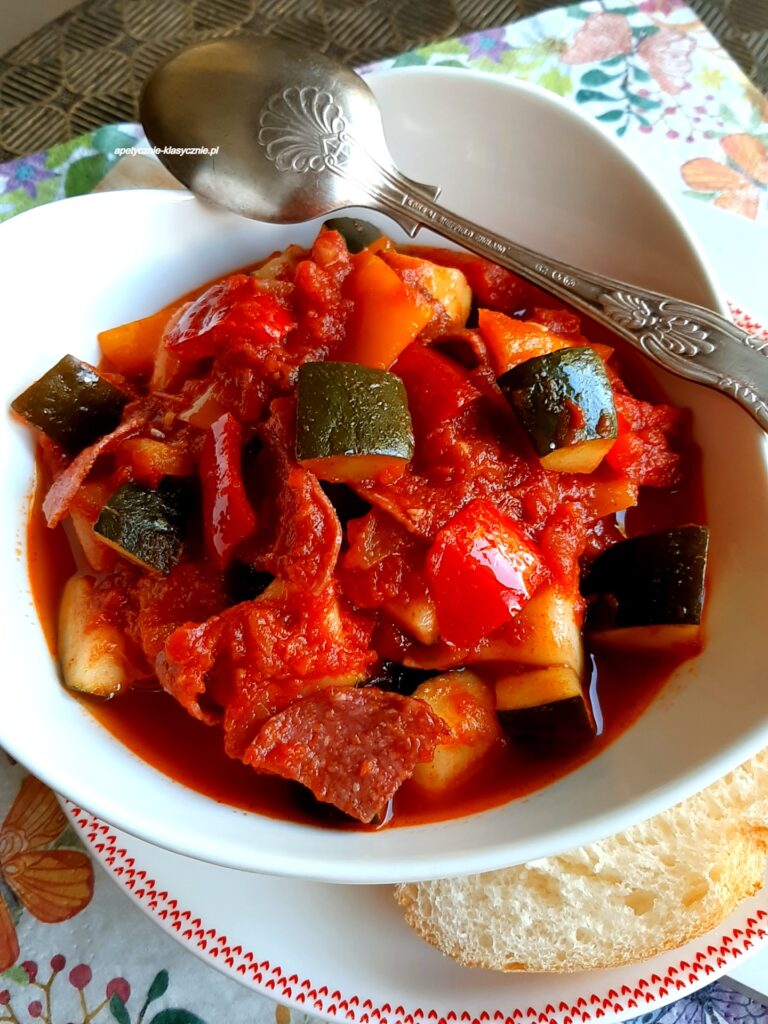 Znane i lubiane danie wzbogacone cukinią i salami. Bardzo smaczna i prosta potrawa jednogarnkowa pochodząca z kuchni węgierskiej. Podstawowy przepis oparty najczęściej na cebuli, papryce i kiełbasie często modyfikuję dodając składniki sezonowe, albo te, które akurat mam pod ręką. Tym razem leczo wzbogaciłam o cukinię, natomiast zamiast zwykłej kiełbasy dodałam węgierskie salami. Dzięki temu leczo jest bardziej pożywne i urozmaicone. Smaku i aromatu dodają czosnek, słodka wędzona papryka w proszku oraz oregano. To danie uniwersalne, które pasuje do ryżu lub pieczywa, albo kaszy. Leczo przygotowane dzień wcześniej i podgrzane smakuje jeszcze lepiej. Polecam serdecznie na obiad lub kolację 🙂