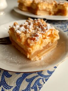 Delikatna i smaczna szarlotka na kruchym, maślanym cieście, z warstwą kwaskowych jabłek, aksamitnym waniliowym budyniem i chrupiącą kruszonką na wierzchu 🙂