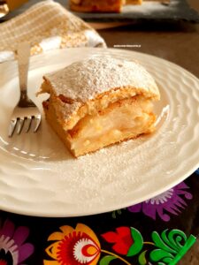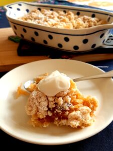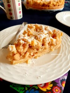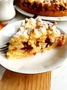 Na spodzie delikatne kruche ciasto, na wierzchu chrupiąca kruszonka, a w środku kwaskowe jabłka i soczyste śliwki, pachnące wanilią i cynamonem 🙂