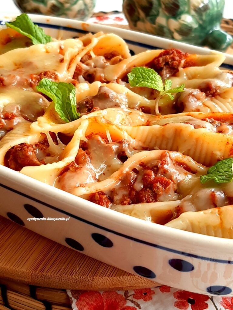 Sprawdzony pomysł na pyszny obiad. Muszle makaronowe nadziewane aromatycznym farszem z mięsa, zapiekane z przecierem pomidorowym (passata) i serem. To danie świetnie wygląda i rewelacyjnie smakuje. Może się wydawać, że to potrawa skomplikowana, ale tak naprawdę można ją łatwo przygotować, a efekt na pewno zachwyci bliskich i przyjaciół. Ugotowanie makaronu, przygotowanie nadzienia i zapiekanie jest proste, chociaż wymaga trochę czasu, ale dla tej potrawy warto. wystarczy wymieszać składniki, co nie zajmuje więcej niż 15 minut. Do farszu można użyć każdego rodzaju mięsa mielonego, ja zrobiłam z wołowiny, przyprawy to sprawa gustu, ale warto, aby nadzienie było intensywne. Gorąco polecam 🙂