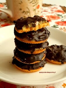 Każde ciasteczko z dodatkami zanurzamy w czekoladzie lub smarujemy wierzch czekoladą, układamy z powrotem na talerzu i gotowe. Smacznego 🙂