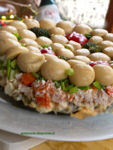 Następnego dnia wyjmujemy sałatkę z lodówki, zdejmujemy górną folię, przykrywamy talerzem, odwracamy do góry dnem, wykładamy na talerz, delikatnie zdejmujemy obręcz tortownicy i folię. Smacznego 🙂