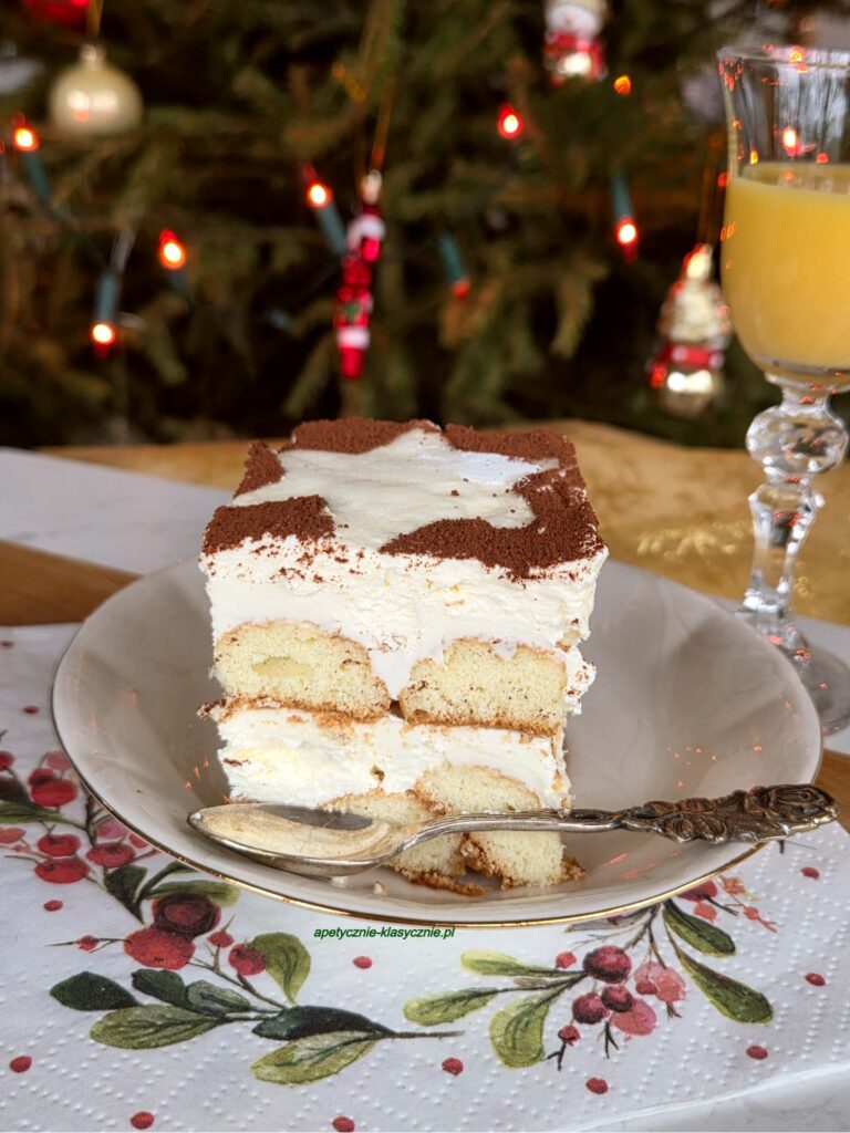 Tiramisu, czyli znany od lat włoski deser w rewelacyjnej piernikowej wersji z ajerkoniakiem. Prosty do zrobienia, lekki, pyszny, pachnący piernikowo. Aksamitny krem z mascarpone i śmietanki (bez jajek) z dodatkiem słodkiego jajecznego likieru oraz biszkopty moczone w kawie z dodatkiem przyprawy do piernika. Uwielbiam tiramisu od lat, najczęściej przygotowuję według klasycznego przepisu z jajkami i mascarpone oraz biszkoptami maczanymi po prostu w kawie, ale wersja piernikowa z ajerkoniakiem smakuje obłędnie i pasuje idealnie na święta Bożego Narodzenia. Polecam gorąco, szczególnie zimą 🙂