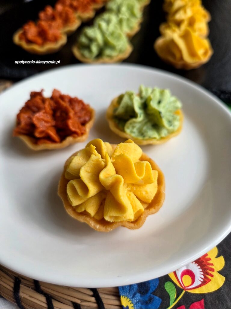 Wyglądają przepysznie! Kruche babeczki z trzema pastami to świetny pomysł na imprezę – efektowne, kolorowe i pyszne w smaku. Idealne na małe przekąski bez sztućców!